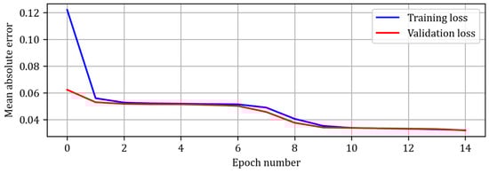 For all hidden layers, the rectified linear unit (ReLU) activation function was used. The network was trained with the aid of the randomly selected 70% of periodograms captured for normal operation of the gearbox (gear pair I), which resulted in 616 training samples. The other 30% (264 samples) was used for validation. As the measure of loss, the mean absolute error was applied (Figure 10).