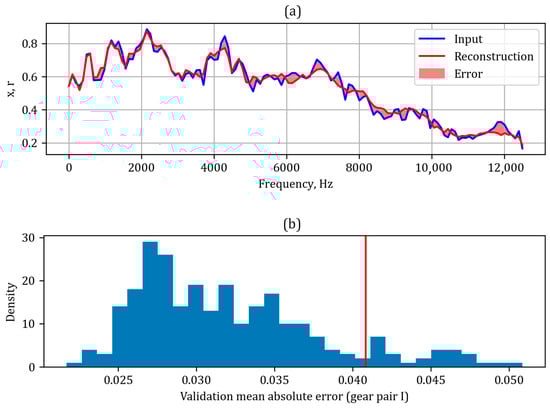 Results of validation: (a) example of input x, reconstruction r and error; (b) distribution of reconstruction error for testing the data of gear pair I.