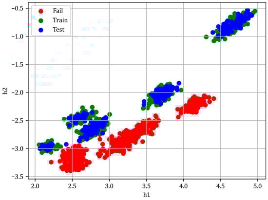 The data formed five clusters for normal operation and four clusters for the failure state. Each cluster corresponded to the different measurement series, conducted at different times and states of gear wear. As can be noted, there was no clear separation between the points representing the measurements of the operating and failing gears. First, two principal components explained no more than 61.3% and 9.9% of the data variance. This led us to the conclusion that more robust, nonlinear treatment was needed.