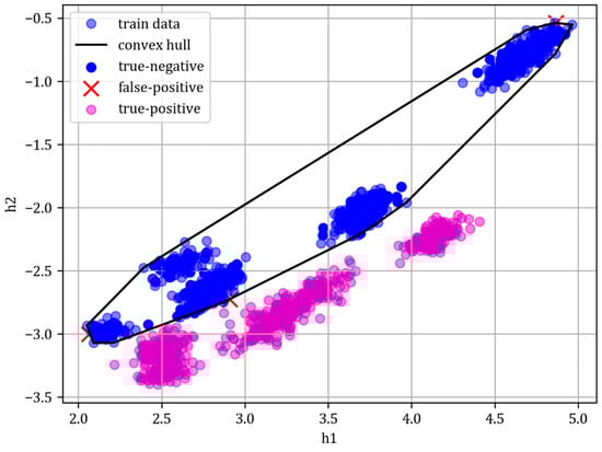 The generator consisted of three hidden dense layers with a rectified linear unit activation function and aims to generate the fake output based on real input data (periodogram). The discriminator predicts whether the input is real or fake by mapping the input into two-dimensional probability space. As in the case of the generator, the discriminator was designed as a deep neural network with three hidden dense layers with rectified linear unit activation function. As a loss function for the generator and discriminator while training, the binary cross entropy was used. The network was trained only on periodograms for a normal state of operation. The probability space (output) of the discriminator, along with convex hull-based clustering, is shown in Figure 21.