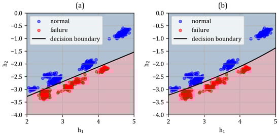To show the nature of the latent data separation and compare the results with semi-supervised methods, we conducted supervised training of the support vector machine models. For this purpose, we reorganized the dataset and granted labels to normal and failure subsets. The labeled data were used with a 70–30% training–test split. Results for the linear and nonlinear support vector machine (SVM) models are given in Figure 18.