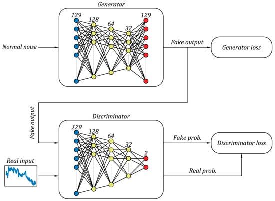 Another technique that can be used for unsupervised anomaly detection is the generative adversarial network (GAN), widely used for image generation [19]. This type of network is trained to generate data, making use of the game between the generator and discriminator. If the network is trained on data for a normal state, the probability output space of the discriminator calculated for abnormal data is then used to predict an abnormal state. GANs have been used for anomaly detection in time series data [20], image and tabular data [21], and fault detection in unbalanced datasets [22,23].