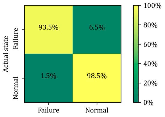 Similar to the case of the autoencoder in Section 5, the proposed approach was very effective (100%) in failure detection in the case of true positive classification. Moreover, the number of normal state predictions in the case of true negative classification was increased to 98.9%. The method misclassified only 1.1% (false positive) of states where the gearbox was actually without damage. The above results showed a very high precision (0.98), F1-score (0.99), and recall (1.00).