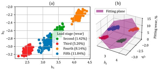 It can be seen that the latent data, mapped into three-dimensional space by adding the pitting wear coordinate (Figure 23b), allowed us to evaluate the pitting rate based on latent coordinates h1 h2. The plane was fitted with a 0.26 regression score. The prediction of wear based on linear regression was not accurate in this case, but it gave some idea of how the data points were spaced. A more sophisticated nonlinear regression should be applied like a decision tree or polynomial regressor, which would perform well in supervised learning within the latent space.