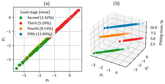 Labelled latent data of an autoencoder: (a) latent space; (b) percentage pitting wear.