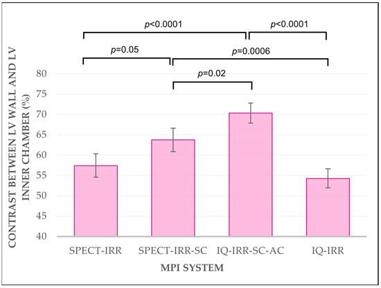 The influence of the MPI system on the contrast between the LV wall and the LV inner chamber was evaluated using a one-way main-effect ANOVA. The MPI system was considered as the independent variable, and the contrast between the LV wall and LV inner chamber as the dependent variable.