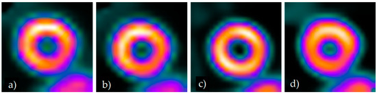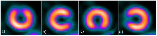 A comprehensive image quality evaluation was performed by analyzing a set of physical image quality descriptors to assess and compare the performance of different MPI systems. The contrast was evaluated through the contrast between the LV wall and the LV inner chamber, the contrast of the PD with respect to the LV wall, the intrinsic contrast, and the net contrast. The Fiji edition of ImageJ open-source software, (National Institutes of Health, Bethesda, MD, USA) for processing and analyzing image data, version 2.14.0/1.54 f, was used. In ImageJ, the short-axis images were opened as a 32-bit file. The regions of interest were drawn using the freehand option. The mean number of counts in the regions of interest were used in the calculation of the descriptors. In ImageJ, when displaying short-axis images, the lookup table (LUT) “cool” was applied.