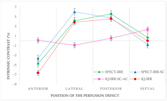 Figure 4). The non-uniformity of the signal intensity is more pronounced for SPECT-IRR-SC and IQ-IRR in the lateral and anterior position, respectively. The observed decrease in the signal intensity in the lateral and posterior positions for the majority of the