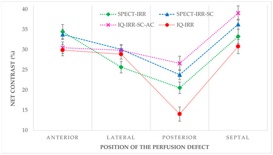 NC values for the lateral, posterior, and septal positions is visible compared to those for SPECT-IRR. Concerning the effect of lesion position on