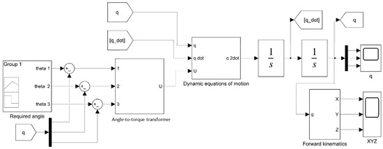 The previously derived and discussed kinematic and dynamic mathematical models were used to create a MATLAB model for Equations (6)–(8) and (25) of the VSL robot. Since the input to the model is torque, an angle–torque transformer must be added to compare it to the test rig, where the angle is the input and the motor’s torque cannot be controlled [49]. The modeling parameters are measured from the test rig. For each link, the center of gravity and the second moment of inertia I are calculated by accurately drawing the parts in SOLIDWORKS with the defined materials used in the test rig. The mathematical model implemented in MATLAB/SIMULINK 2022a is shown in Figure 3. The test rig parameters used for the model in SIMULINK are tabulated in Table 2.