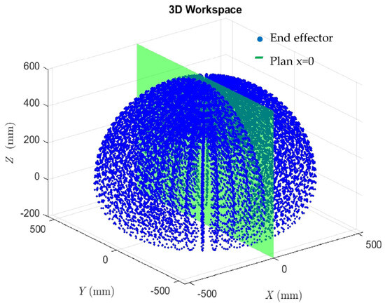 The workspace of the 3DOF VSL manipulator shows the maximum and minimum values that the manipulator can achieve, taking into account any joint limitations, physical obstacles, or constraints in the environment. It helps in understanding the reachable space and the potential applications and limitations of the manipulator in various tasks and operational scenarios. Figure 4 shows the 3D workspace, while Figure 5 shows a slice of the 3D workspace at x = 0 plane.