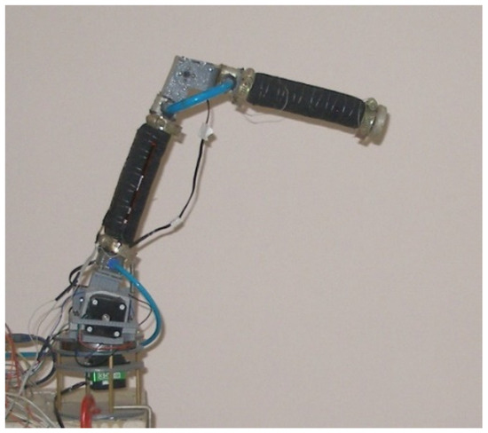 A 3 DOF VSL manipulator prototype was developed in our laboratory from a combination of silicone rubber structures, polypropylene plastic mesh, and fabrics (see Figure 7). VSLs have the ability to control their stiffness and are pneumatically actuated. By adjusting the pressure value within their structure, the links can be tuned to different stiffness levels. Our prototype is equipped with a pressure sensor (BD SENSORS 26.600 G-11002-R—1-5-100-300-1-000) to sense the robot’s body possible collisions with a human. The base and elbow motors were serial servomotors with built-in encoders to measure the angle of rotation. The shoulder motor was a stepper motor with a gearbox and an encoder connected to the shaft. All experiments were carried out at a pressure of 2 bar in the links. This pressure was selected experimentally. The highest pressure for maximum stiffness and, at the same time, the pressure change at collision could be determined.