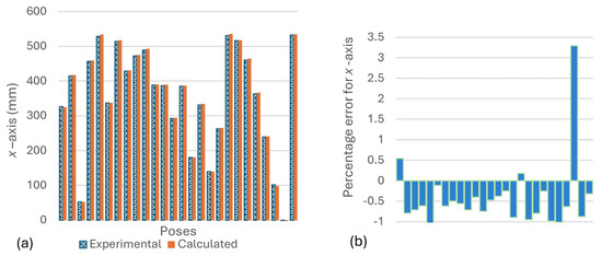 (a) Chart for the experimental position of end tip along x-axis of the manipulator and the calculated position for different poses. (b) Percentage error for x-axis.