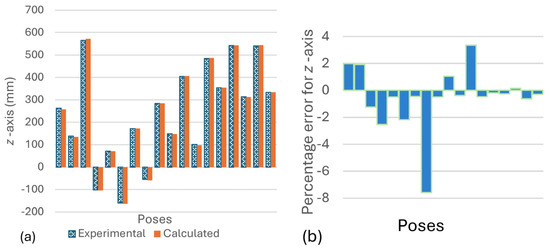 (a) Chart for the experimental position of end tip along z-axis of the manipulator and the calculated position for different poses. (b) Percentage error for z-axis.