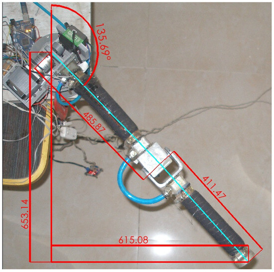 In this experiment, the VSL robot was given a pose, followed by the recording of its movement from its pose to the given pose at a frame rate of 30 fps. First, the second joint (θ2) was moved from 90° to 16°, then, the third joint (θ3) was moved from 0° to −45°, and, finally, the first joint was moved from 0° to −43°. Then, using the SOLIDWORKS program, the photos of each frame were inserted into a 2D drawing, the angles of the robot’s movement were measured manually, and the final position of the tip was tracked, frame by frame, from the beginning until it came to a complete stop. Examples of these images are shown in Figure 13, Figure 14 and Figure 15. The same pose was then applied to the model in SIMULINK and its motion was also recorded. Finally, the collected experimental and simulated data were recorded, plotted, and compared.