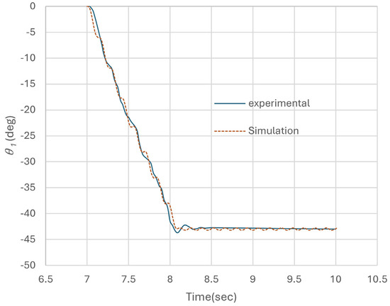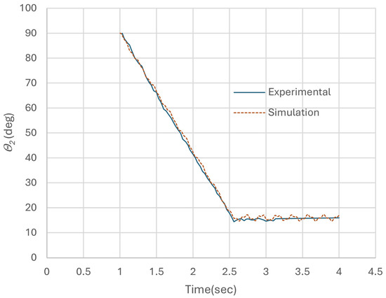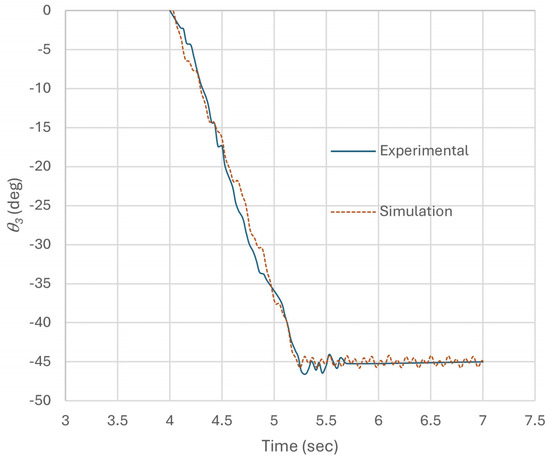 The results of the experiment show that, although the model’s responses were adequate, they did not have the degree of accuracy we would have liked. The average error of the angular displacement for the first joint was 0.63°, for the second joint 1.06°, and for the third joint 1.27°. In order to achieve greater precision, it is essential that we carry out further investigations into the damping and stiffness coefficients. The plots for the three angles of the joints versus time for the experimental and simulated responses of the manipulator are illustrated in Figure 16, Figure 17, and Figure 18, respectively.