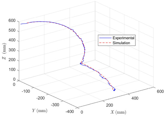 The results of our research show that the end position curve obtained from the experiments with a camera and the positions from the simulated model agree well, as shown in Figure 19. The average errors in the x, y, and z directions were 6.24 mm, 6.4 mm, and 2.93 mm, respectively, demonstrating reasonable accuracy between the experimental and simulated data. However, further analysis of the model is required to increase accuracy. A sample of the experimental and simulated data and the error between them can be found in Table 4.