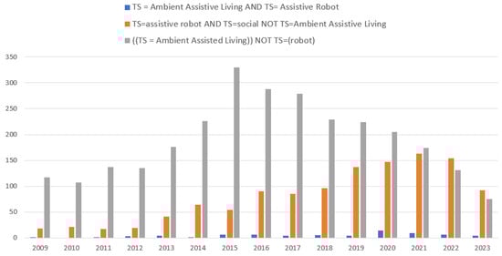 - Both topics, especially the former, far exceed the interest in the topic TS = Ambient Assistive Living AND TS = Assistive Robot. Only a total of 68 articles were published in the period between 2009 and 2023.