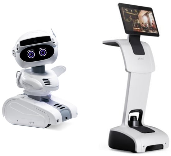 Similarly, an additional example is led by the Spanish company Grupo Saltó [35]. Together with the Barcelona City Council, the company is leading the deployment of a social robot at home to assist elderly people to live independently at home. In the first phase, from February 2020 to February 2021, the ARI robot (a Misty-II, see Figure 2) was deployed in 10 homes, to assist people over 65 years of age and with a good degree of mental and physical autonomy, who live alone at home. These users are assisted by one of the four robots used in the pilot for a period of 2 months. The objectives are to reduce the loneliness of the person, as well as to monitor their state of health and prevent them from forgetting to take their medication. In a second phase (lasting 3 years), the pilot will be extended to 100 homes, and the robot will be replaced by a Temi (Figure 2 (Right)).