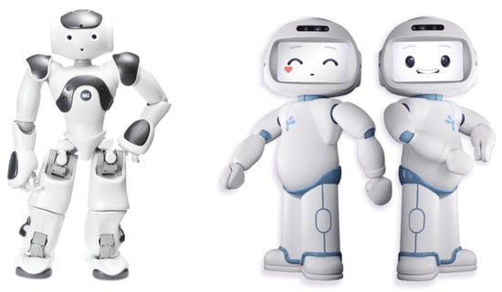 When analyzing the publications on the subject, the first of the points that can be highlighted is the diversity of robotic platforms used. Table 1 summarizes some examples, clustered into three main groups. One group includes platforms that are small in height and whose main advantage is their ability to display either facial or gestural emotions. One example is the previously mentioned Misty-II robot (Figure 2 (Left)). Other examples are the popular Nao [37,38,39] or LuxAI’s QTRobot [40,41,42]. Figure 3 shows the external aspect of these two platforms. Aldebaran Robotics’ Pepper robot was used by Bui et al. [43] and Bui and Chong [44]. This robot has a higher motor capacity, which allows it to move around the environment, and a larger size, which facilitates face-to-face interaction with the user. In general, they are emotional robots designed primarily to interact with people. They present hardware limitations when it comes to performing other tasks. For instance, it is common to deploy an external camera to increase the sensory capabilities of the Nao robot [39].