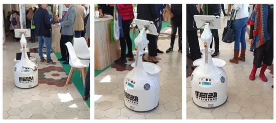 However, only a few studies have deployed SAR in real environments. A relevant example is Strands [29], in which an autonomous social robot was deployed in the common areas of a residence hall. In this case, the robot was deployed in large-scale environments to simultaneously assist multiple users (e.g., by giving them directions). This context poses different challenges than those evaluated in the MoveCare, CompanionAble, or SERROGA projects [30,31], where the goal was to provide assistance to a single user in their own home. More recently, the SYMPARTNER project [32] showed the results obtained in a 20-week field study with 20 elderly people (one week per participant where the system was available to the user for five days).