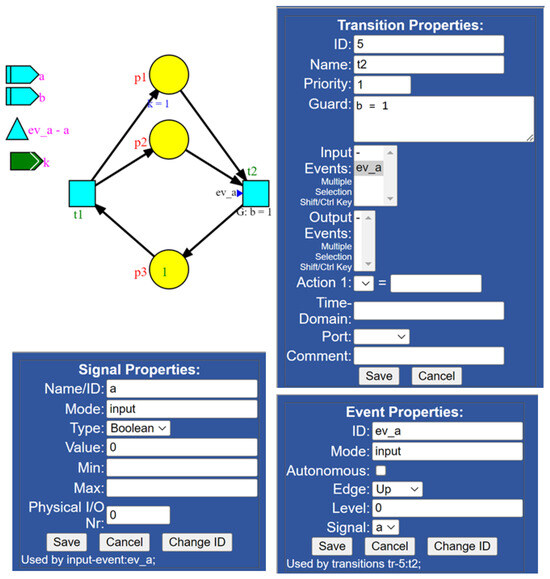 In the simple model presented in Figure 1, for transition to fire, places and must be marked, the guard evaluated to (input signal b equals to 1), and the event (associated with input signal a) occurs. Figure 1 shows the simple IOPT net, as well as the relevant interfaces (to provide characteristics for signal a, event , and transition ) provided by IOPT-Tools to support its implementation.