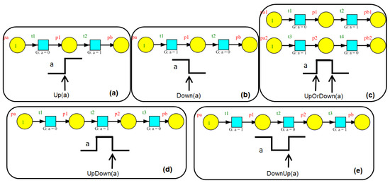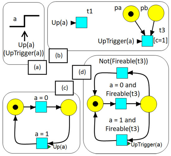 Figure 5b illustrates the approach: transition t1 is receptive to the event Up associated with signal a, following the operational model of Figure 5c; similarly, transition t3 is receptive to the event UpTrigger, which is associated with signal a and also to this specific transition t3, following the operational model of Figure 5d. Regarding transition t3 firing, the analysis of the signal evolution is carried on if and while transition t3 is fireable. Transition t3 is fireable when it is enabled (places pa and pb in Figure 5b are marked) and ready (the guard composed of signal c equals to 1 and evaluates to true). In Figure 5d (and other figures to be presented in the next sections), the evaluation of this condition is included in the notation as and . In the presented case of Figure 5d, the condition is evaluated by .