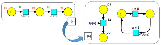 The proposed approach intends to shrink the model collapsing sequence of nodes associated with a specific signal evolution into an event depending on the same signal evolution. In this sense, instead of using the Petri net model presented in Figure 3a associated with the Up event (introduced in Figure 2a), it is proposed to use the simplified model presented in Figure 3b, composed of a simplified model where transition ta encapsulates the sub-model composed of t1, p1, and t2, which will be executed concurrently with the model responsible for the analysis of the signal a evolution and for the generation of the event Up(a).