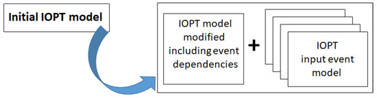 In this sense, the proposed strategy to improve the compactness and legibility of the model relies on encapsulating the specific evolution of the signals into the events, which will be associated with the transitions firing the sub-models characterizing the specific evolution of the signals. Those transitions will be constrained by the event’s occurrence, which in turn characterizes the specific evolution of the signal and will be described through specific sub-models to be executed concurrently. The overall approach is summarized in Figure 4, where the “IOPT input event model” will be intrinsically considered available (without the need to be explicitly edited). Therefore, the model to be produced by the designer will be much smaller, as it will benefit from the encapsulation of the event dependencies.
