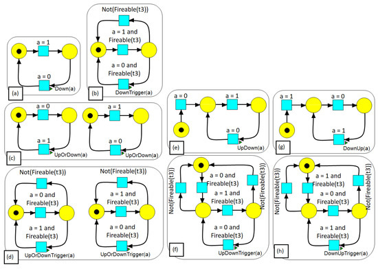The operational models associated with the events listed in Table 1 to be executed concurrently with the model specified by the designer: (a) Down event, (b) DownTrigger event, (c) UpOrDown event, (d) UpOrDownTrigger event, (e) UpDown event, (f) UpDownTrigger event, (g) DownUp event, and (h) DownUpTrigger event.