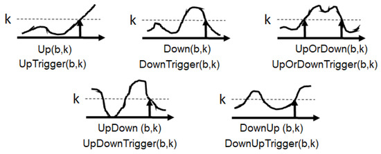 This section presents the set of events associated with multivalued signals, where a range of integer values can be read (digital inputs). Similarly to the analysis of Boolean signals, Table 2 presents the definition of four sets of five events generated through the evolution analysis of multivalued signals, providing updated definitions for the former set composed of , , , , and events (which were initially proposed in [1,12,25]), where a threshold value k is used for comparison with a predefined level. A second set of events is proposed associated with similar events constrained by the verification of conditions to fire the transition with whom they are associated; this set is composed of , , , , and , also considering a value k for comparison. Figure 7 presents the timings associated with generating the referred events.