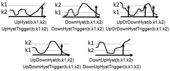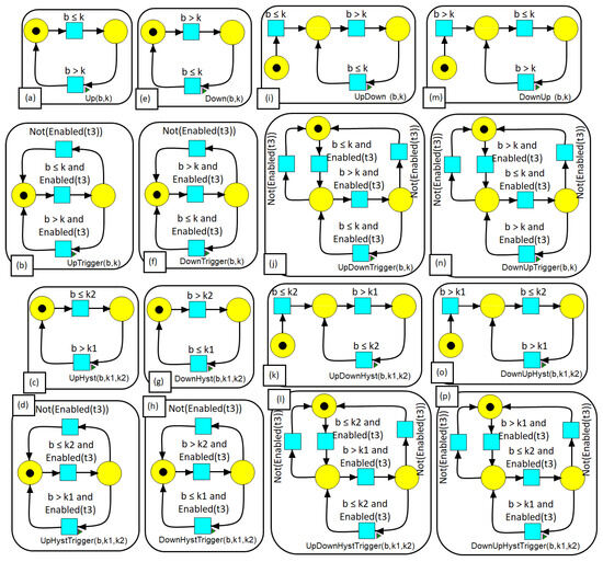The operational models associated with the events listed in Table 2 to be executed concurrently with the model specified by the designer: (a) Up event, (b) UpTrigger event, (c) UpHyst event, (d) UpHystTrigger event, (e) Down event, (f) DownTrigger event, (g) DownHyst event, (h) DownHystTrigger event, (i) UpDown event, (j) UpDownTrigger event, (k) UpDownHyst event, (l) UpDownHystTrigger event, (m) DownUp event, (n) DownUpTrigger event, (o) DownUpHyst event, and (p) DownUpHystTrigger event.
