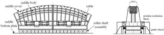 Large-span bridges have been widely adopted because of their great crossing ability [1,2,3]. The saddle structure is an important part of a large-span suspension bridge as it helps to realize the large span and crossing function [4,5]. It is used as the main support component for the suspension cable or diagonal cable to pass through the top of the tower and transfer the cable force. It plays an important role in reasonably reducing the maximum bending moment at the bottom of the tower, effectively adjusting the load-carrying capacity of the tower and the scale of the foundation, as well as equalizing the cable force of the main cable [6]. At present, the main saddle structure used in large-span bridges can be divided into an anti-slip saddle and a rolling saddle. The anti-slip saddle is generally set up as an anti-slip device in the saddle balance system, to avoid the slip phenomenon in a suspension cable or cable-stayed cable during the bridge operation process [7]. The rolling saddle is optimized and designed based on the anti-slip saddle structure. A row of rollers is set below the saddle base, which changes the original form of friction from sliding friction to rolling friction, and leads to the automatic equalization of the cable system [8].