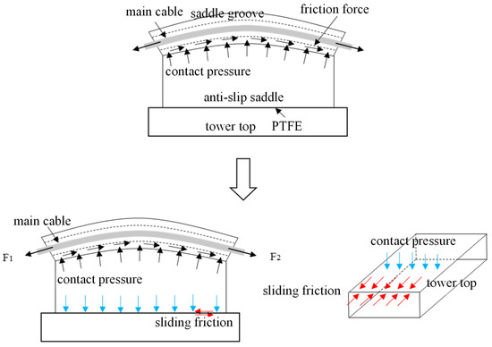 The cable saddle transmits the cable force at the tower. Due to the curved shape, the saddle is subjected to contact stresses from the cable and transmitted to the tower. The inside of the saddle groove is also subjected to friction in contact with the cable, as shown in Figure 3. Gradually, the unbalanced horizontal force at the top of the tower increases, material loss and structural wear inside the saddle occurs, and the tie rope slips. The cable saddle is not rigidly connected to the cable tower, but is lubricated by a PTFE slip sheet to accommodate the slip phenomenon. A face contact is formed between the saddle and the top of the towers, and there is no significant stress concentration in the contact zone.
