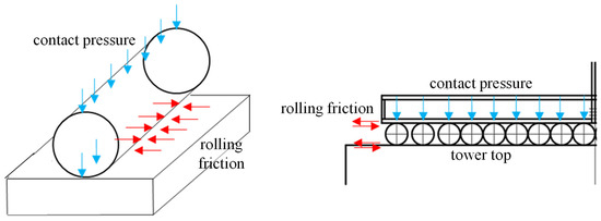 Unlike an anti-slip saddle, a rolling saddle is in contact with the top of the towers through roller shafts, as shown in Figure 4. The contact pressure between the saddle and the main cable is transferred to the bottom of the saddle and to the top of the tower via the roller shaft. The friction between the roller shaft and the bottom of the saddle and the top of the tower is rolling friction. Thus, the saddle only provides vertical forces, and the adverse effects due to the rise and fall in the overall temperature can be eliminated by lateral rolling. The roller shaft and the upper and lower plates form a line contact, and there is a significant stress concentration in the contact area, which results in a relatively large structural deformation and material yielding.