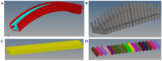 Taking the rolling saddle of the Zhanggao River Crossing South Channel Bridge as an example, its mechanical situation in the roller area was investigated. Its different components are constructed, including a cable trough, saddle ribs, saddle base and rollers, as displayed in Figure 5. The length and diameter of the roller are 3500 mm and 800 mm, respectively. The length, width, and thickness are 18,000 mm, 4600 mm, and 1000 mm, respectively. The width of the saddle rib is 120 mm. In this paper, the computational analysis of the part of the saddle, the roller and the top surface of the tower was carried out. The middle longitudinal ribs were symmetrically restrained, and the upper and lower surfaces of the roller were in linear contact with the bottom surface of the saddle and the top surface of the tower, respectively. Under vertical pressure, fixed constraints in all directions were set between the saddle and the grill, fixed constraints in the transverse and longitudinal directions were set on both sides of the upper part of the saddle, transverse fixed constraints were set on the base of the saddle and the rollers, and full fixed constraints were set on the top surface part of the cable tower.