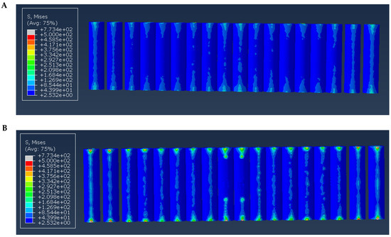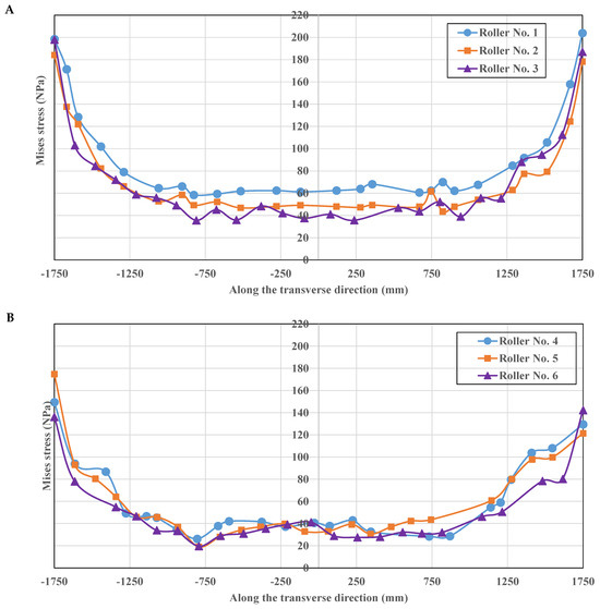 Mises stress in the surface of the rollers: (A) upper surface; (B) lower surface.