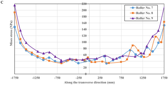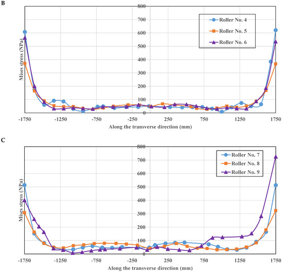 Von Mises stress distribution in the lower surface of the rollers: (A) Roller 1~3; (B) Roller 4~6; (C) Roller 7~9.