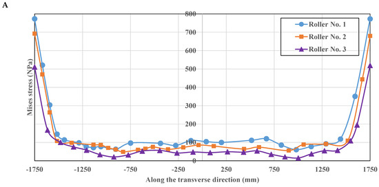 Mises stress distribution in the upper surface of the rollers: (A) Roller 1~3; (B) Roller 4~6; (C) Roller 7~9.