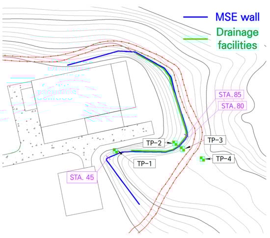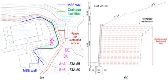 The MSE wall under study was constructed in 2005 to secure a site on the backside and extends 211 m. A longitudinal crack deformed the corner height of the MSE wall by 14.1 m. The longitudinal crack-affected section was managed through displacement measurements. Figure 1 shows the construction plan and cross-sectional view of the MSE wall displacement section.