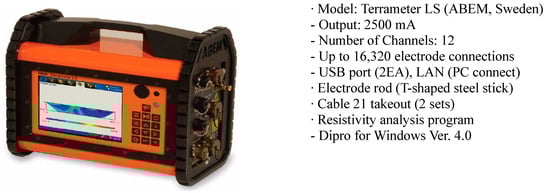 The electrical resistivity survey was conducted to determine the condition of the reinforced earth mass of the MSE wall. An electrical resistivity survey is a common non-destructive exploration technique used to determine the condition of the ground by measuring the potential difference caused by the difference in electrical resistivity among the differences in underground electrical properties. The electrical resistivity survey instrument supplies power to two current electrodes through an ammeter connected to a power source. It works on the principle that the potential difference is measured using an electrometer connected to two other potential electrodes through the supplied current. In this research, the electrode spacing of the electrical resistivity survey was installed at 5.0 m in order to consider the exploration depth and exploration extension of the ground. In addition, the ground condition was evaluated to identify leakage and problem areas distributed inside and around the MSE wall. The instrument used for the electrical resistivity survey is shown in Figure 3.