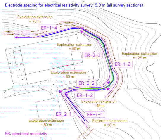 Figure 4 shows the electrical resistivity survey location plan of the case study’s site. As shown in Figure 4, four zones were surveyed at the top and bottom of the MSE wall from the ER-1-1 line to the ER-2-3 line. ER-1 and ER-2 lines refer to the exploration of the original ground and backing ground in front of the MSE wall, respectively.