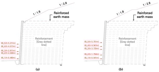 An MSE wall consists of wall facings, reinforcements, and backfill soil. The wall facing not only forms the appearance of the MSE wall but also prevents the loss of backfill soil. Generally, wall facing is applied to panels or blocks. Reinforcements are divided into non-extensible and extensible reinforcements according to the material properties. Non-extensible reinforcements include smooth steel strips, ribbed steel strips, and steel grids. Elastic reinforcements include geosynthetics, such as geogrids and geotextiles. The reinforcement interacts with the backfill soil to form the reinforced earth zone of the MSE wall [12,13].