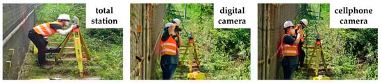 The field experiment employed a C3 total station manufactured by Trimble Inc., (Westminster, CO, USA). The specifications of Trimble C3 were 800 m and 3.0 mm + 2 ppm for the measurement distance and accuracy without reflective targets, respectively. With the prism, the measurement distance and accuracy were 5000 m and 2.0 mm + 2 ppm, respectively. The digital camera used was D7100, which has a CMOS sensor manufactured by Nikon (Tokyo, Japan). The D7100 has 24,710,000 pixels. The cellphone camera was a Galaxy S21 model from Samsung Electronics (Seoul, Republic of Korea) with 12 million pixels.