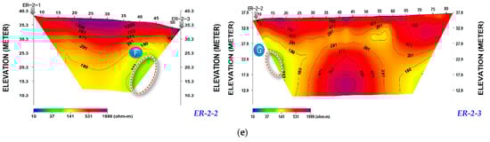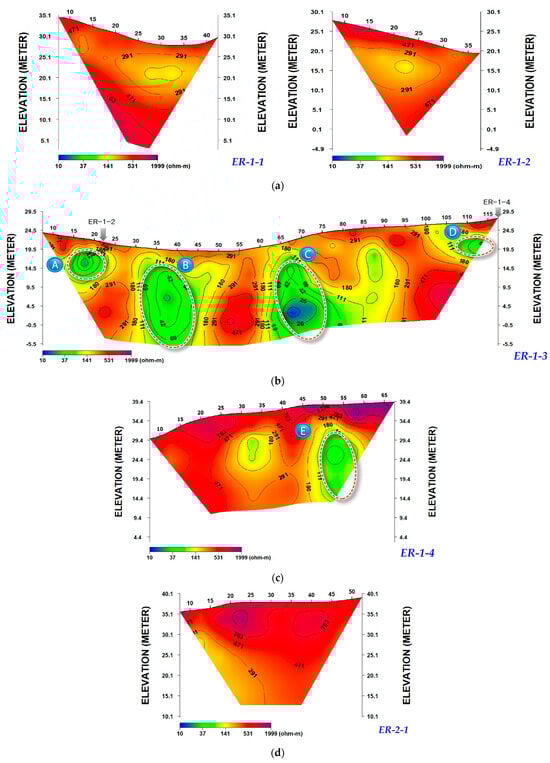 Electrical resistivity survey results: (a) ER-1-1 and ER-1-2; (b) ER-1-3; (c) ER-1-4; (d) ER-2-1; (e) ER-2-2 and ER-2-3.