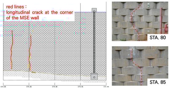 Therefore, the risk area for the MSE wall of the case site was determined to be the corner based on the results of the electrical resistivity survey. In other words, this area was evaluated as requiring continuous monitoring. The longitudinal crack status of the corner is shown in Figure 9.