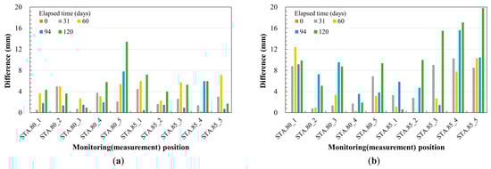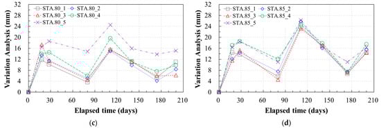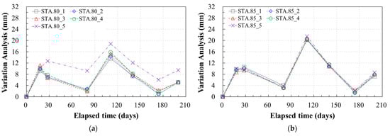 Figure 12a,b show the results of the traditional monitoring method. Despite the differences between the displacement values of the neighboring STA.80 and STA.85, a similar trend was observed in the temporal changes in the displacement. The minimum and maximum displacements at STA.80 and STA.85 were 3.162–13.928 mm and 4.472–18.412 mm, respectively.