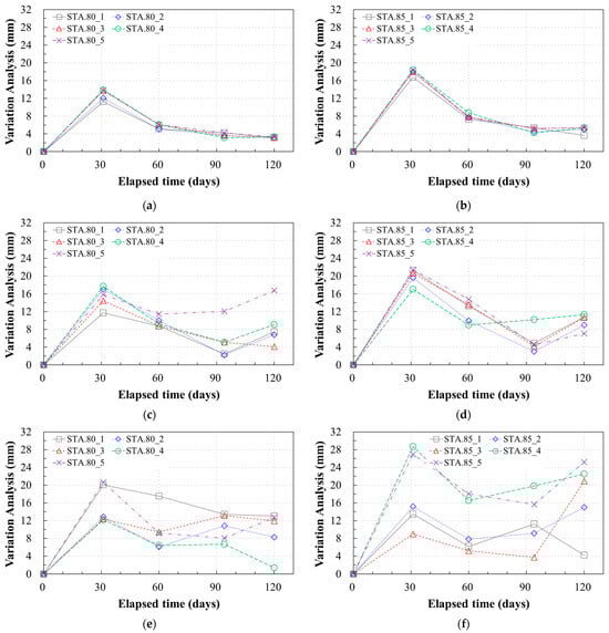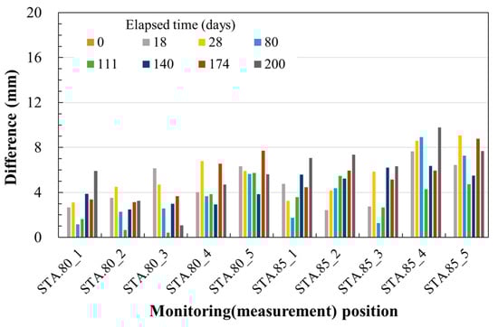 For STA.80, the two highest error levels occurred at 80 days and 174 days from the initial measurement date. STA.85 showed similar results. The largest errors occurred at positions STA.80_4–STA.80_5 and STA.85_4–STA.85_5, which means that the error was larger when the displacement was relatively large.