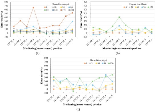 First, the error rate was evaluated through field experiment results conducted for about 7 months using the traditional monitoring method and digital camera-based digital image photogrammetry. The error rate of the digital camera was found to be the largest when the elapsed time was 174 days. In particular, as shown in Figure 14a, the maximum error rate was 655% in STA.80_4, and the error rates of STA.85_4 and STA.85_5 were 433% and 516%, respectively.