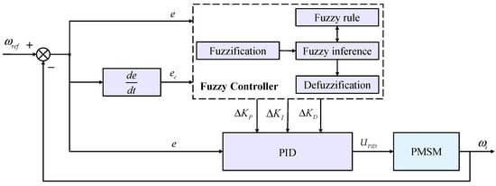 To uphold the comprehensive performance of multi-axis synchronization, beyond the adoption of an appropriate multi-axis synchronization control strategy, integration with suitable synchronization algorithms becomes imperative to ensure the precision of individual motor control. The controllers depicted in Figure 2 typically employ PID control algorithms. Nevertheless, conventional PID algorithms are limited to linear systems and may fail to accomplish dynamic regulation while exhibiting synchronization deficiencies. Among various algorithms, fuzzy control, devoid of reliance on exact mathematical models of the controlled entity, exhibits superior robustness and adaptability, rendering it highly suitable for deployment within the vector control system of permanent magnet synchronous motors (PMSMs). Consequently, this study amalgamates the fuzzy control algorithm with a conventional PID controller to formulate a fuzzy PID controller capable of autonomously adjusting parameters in response to external condition variations. This integration effectively enhances system stability and dynamic response performance.